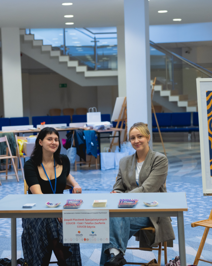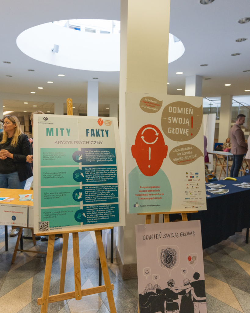 Na korytarzach Wydziału Nauk Społecznych powstała również strefa stoisk informacyjnych, gdzie swoją działalność prezentowały organizacje i instytucje wspierające zdrowie psychiczne: Odmień Swoją Głowę, Stowarzyszenie Na Drodze Ekspresji (Akademia Don Kichota), Centrum Samopomocy w Gdyni, Fundacja Pozytywni.pl, Środowiskowy Dom Samopomocy Maczka 1, Zespół Placówek Specjalistycznych, COUCB oraz Stowarzyszenie Wsparcia i Interwencji Support. Było to miejsce rozmów, wymiany doświadczeń i zwykłej ludzkiej obecności – bez której żadne wsparcie nie ma sensu.