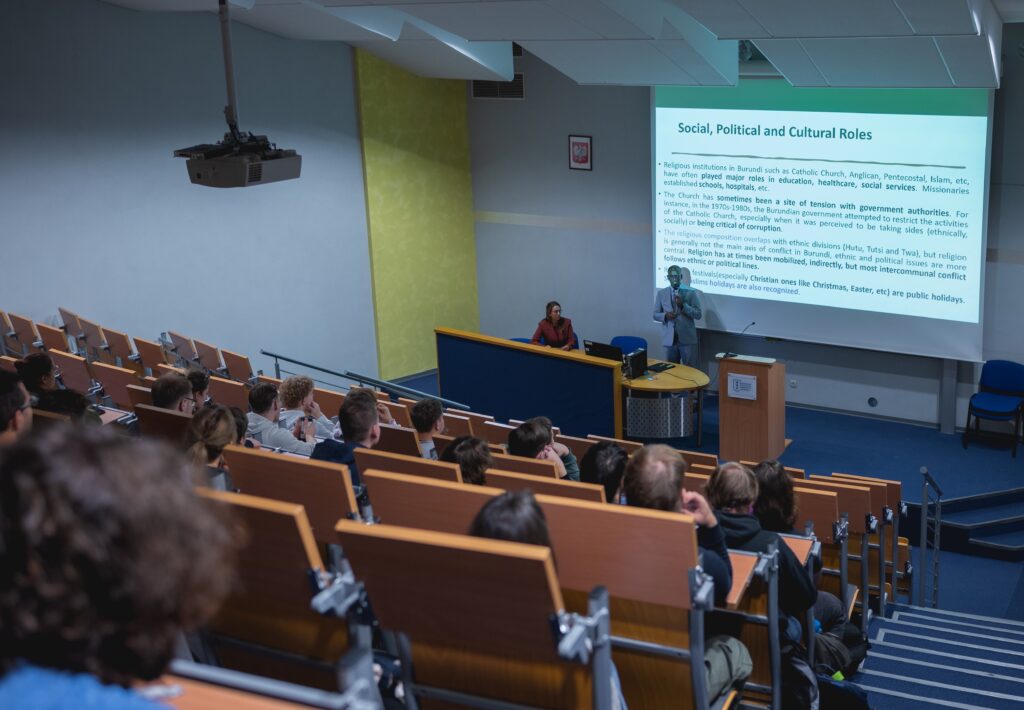 Z kolei delegacja z Burundi poprowadziła otwarte wykłady dla studentów Wydziału Nauk Społecznych, między innymi na tematy: „The system of native African Religion” oraz „Religion in Burundi”. Pierwszy z wykładów przybliżał tradycyjne systemy religijne Afryki Subsaharyjskiej — ich strukturę, rytuały i oddziaływanie społeczne. Drugi koncentrował się na mapie religijnej Republiki Burundi. Przedstawiono dominujące wyznania, religie tradycyjne oraz ich rolę w kształtowaniu tożsamości i życia społecznego. W obu przypadkach studentom umożliwiono udział w sesjach pytań i odpowiedzi, co sprzyjało dialogowi międzykulturowemu i poszerzeniu perspektywy globalnej.