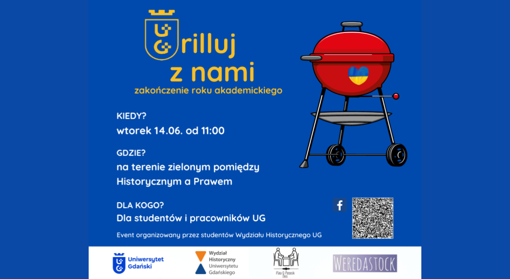 Studenci Wydziału Historycznego UG, w ramach zakończenia roku akademickiego 2021/2022, zapraszają wszystkich studentów i pracowników UG na wspólnego grilla! We wtorek 14 czerwca od godziny 11:00 czekamy na Was na terenie zielonym pomiędzy budynkiem Wydziału Historycznego a Wydziału Prawa i Administracji z pysznymi kiełbaskami i genialną atmosferą historycznego pikniku. Dla wszystkich uczestników przygotowaliśmy: grillowane przekąski zarówno […]