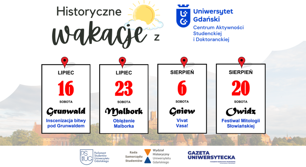 Zapraszamy do udziału w kolejnej jednodniowej, sobotniej wycieczce z cyklu „Historyczne wakacje z CASiD”, organizowanej przez Centrum Aktywności Studenckiej i Doktoranckiej we współpracy z Parlamentem Studentów UG, Radą Samorządu Studentów Wydziału Historycznego UG i redakcją „Gazety Uniwersyteckiej”. Poniżej przedstawiamy szczegóły dotyczące tego wyjazdu. Wycieczka III – Gniew (Vivat Vasa!) – 6 sierpnia 2022 W wycieczce […]