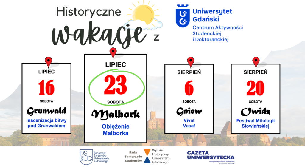 Szanowni studenci, doktoranci i pracownicy Uniwersytetu Gdańskiego, serdecznie zapraszamy do udziału w jednodniowych, sobotnich wycieczkach z cyklu „Historyczne wakacje z CASiD”, organizowanych przez Centrum Aktywności Studenckiej i Doktoranckiej we współpracy z Parlamentem Studentów UG, Radą Samorządu Studentów Wydziału Historycznego UG i redakcją „Gazety Uniwersyteckiej”. Celem tego projektu jest promocja wiedzy historycznej w sposób nie tylko […]