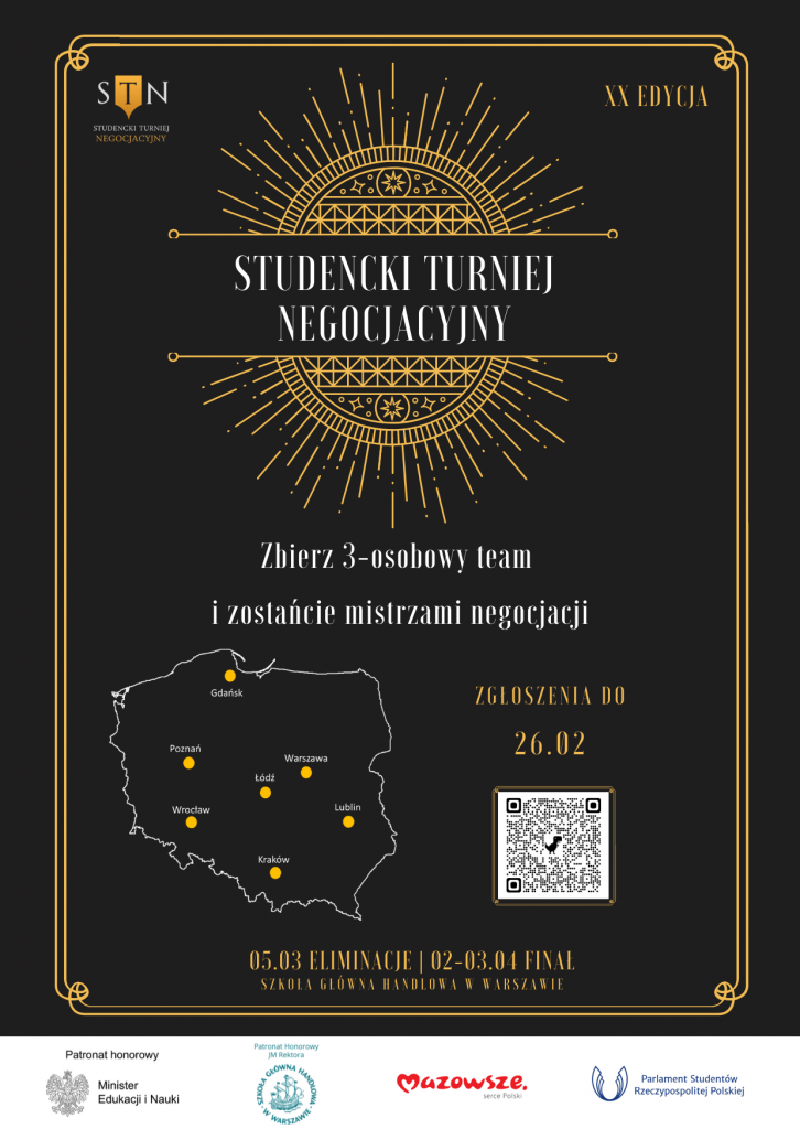 Studencki Turniej Negocjacyjny to ogólnopolski konkurs sprawdzający umiejętności w zakresie technik negocjacyjnych oraz komunikacji interpersonalnej. Skierowany jest przede wszystkim do studentów kierunków ekonomicznych oraz studentów stosunków międzynarodowych i prawa z całej Polski. Jest on organizowany w 2 etapach – eliminacje (5 marca), które odbędą się na uniwersytetach we Wrocławiu, Warszawie, Poznaniu, Krakowie, Katowicach, Lublinie i […]