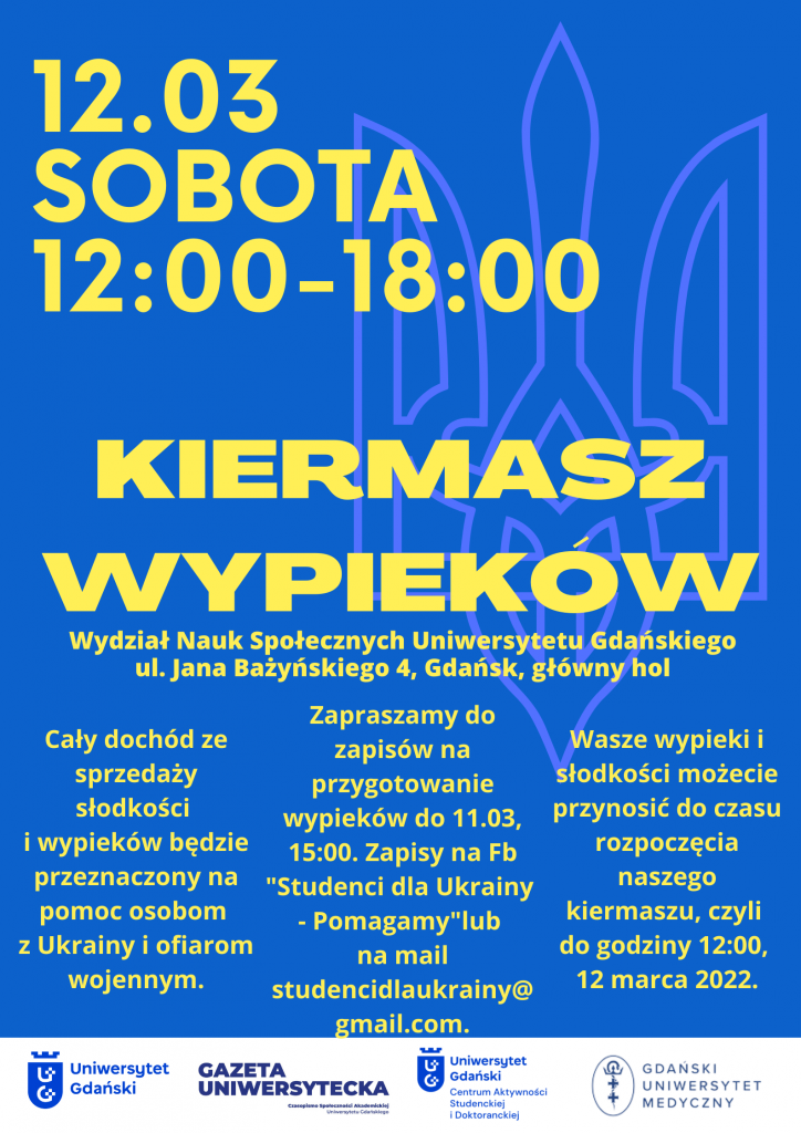 Zapraszamy do wzięcia udziału w kiermaszu wypieków, który odbędzie się w sobotę 12 marca na Wydziale Nauk Społecznych przy ulicy Bażyńskiego 4. Zapisy na przygotowanie ciast przesyłać można do 11 marca do godziny 15:00 na maila studencidlaukrainy@gmail.com. Cały dochód ze sprzedaży słodkości i wypieków będzie przeznaczony na pomoc osobom z Ukrainy i ofiarom wojennym.
