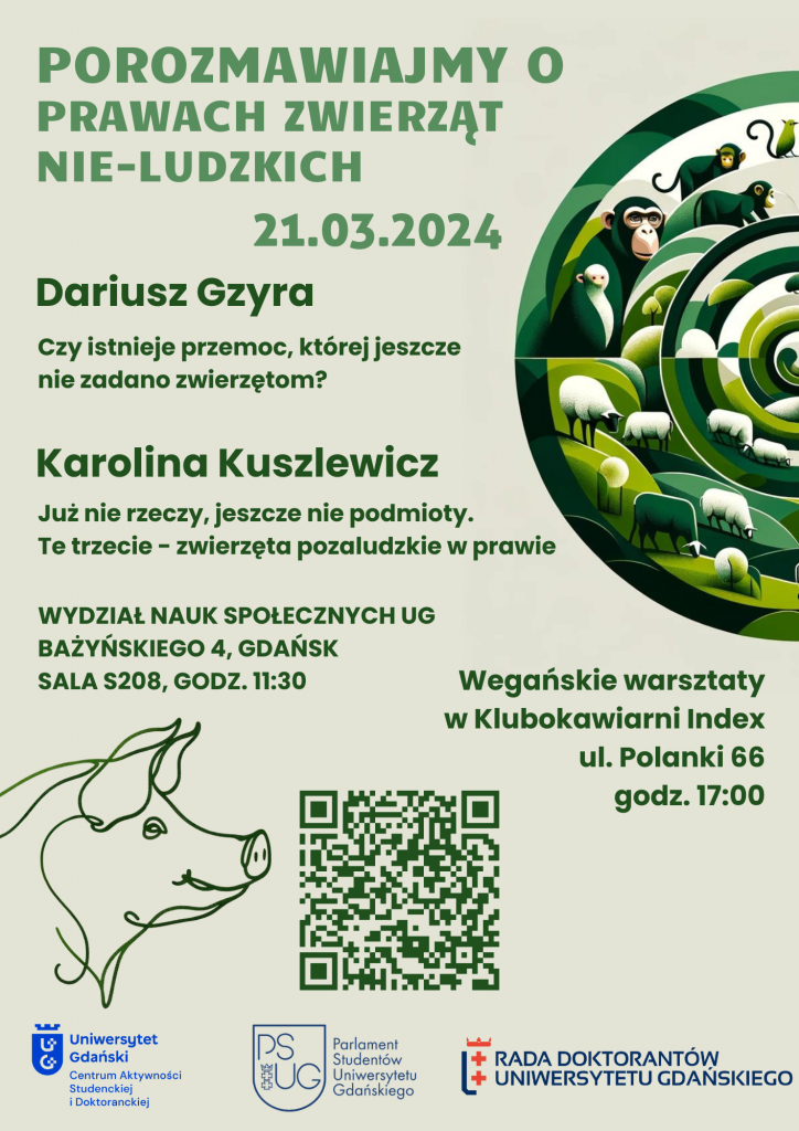Pierwszy dzień wiosny na Uniwersytecie Gdańska to wyjątkowa okazja do tego by rozmawiać o prawach zwierząt nie-ludzkich. Na Wydziale Nauk Społecznych będziecie mogli wziąć udział w prelekcjach osób zaangażowanych w obronę praw zwierząt nie-ludzkich. 11:30 – 12:30 Dariusz Gzyra – „Czy istnieje przemoc, której jeszcze nie zadano zwierzętom?” 13:15 – 14:45 Karolina Kuszlewicz – „Już […]