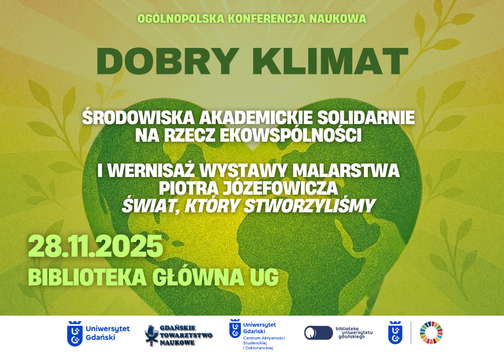 Ogólnopolska Konferencja Naukowa DOBRY KLIMAT Środowiska akademickie solidarnie na rzecz ekowspólności i wernisaż wystawy malarstwa Piotra Józefowicza Świat, który stworzyliśmy 28 listopada (piątek) 2025 roku Biblioteka Uniwersytetu Gdańskiego Gdańsk, ul. Wita Stwosza 53 Organizatorzy O konferencji Katastrofa klimatyczna postępuje i świat, jaki znamy, kończy się nieuchronnie. Chcąc żyć (lepiej) w świecie, który nadchodzi, bezwzględnie musimy […]